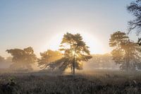 Landschap op het Leersumse veld in Leersum, provincie Utrecht, met zicht op de heide, waar de zon opkomt achter de bomen, waardoor nevelige zonneharpen ontstaan.