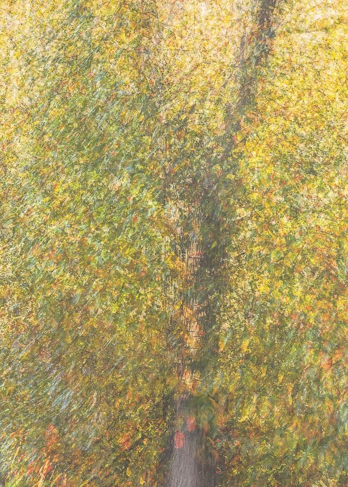 Portret van een boom in herfstkleuren op het Leersumse veld in Leersum, provincie Utrecht, waar gebruik is gemaakt van meervoudige belichting, waar tien foto's werden samengevoegd in de camera. Dit is 'Pep Ventosa' stijl, waarbij de focus bij elke foto op de boomstam blijft, terwijl er telkens een stap opzij wordt gezet. Het geheel is abstract en schilderachtig.