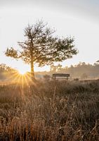 Portret op het Leersumse veld in Leersum, provincie Utrecht, met zicht op een zitbankje naast een boom. De opkomende zon vormt een mooie ster door het kleine diafragma. Op de voorgrond zie je de heidebegroeiing die goud kleurt, wat voor een warme sfeer in de foto zorgt.