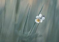 Close up van een bosviooltje, met een zachte grijs groene achtergrond.