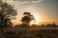 Landschap op het Leersumse veld in Leersum, provincie Utrecht. De zon komt op over het veld en kleurt alles prachtig warm oranje.