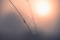 Close up van een spinnenweb, helemaal bedekt met dauwdruppels, met op de mistige achtergrond de opkomende zon.