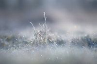 close up van een polletje gras op een koude winterochtend, helemaal bedekt met rijp, glinsterend in het licht van de zonsopkomst