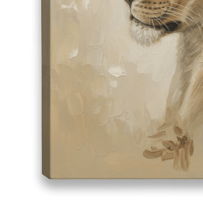 Dit schilderij toont een leeuw en een leeuwin in profiel, omringd door een combinatie van zachte, natuurlijke bloemkleuren. Het werk is uitgevoerd in olieverf en heeft een rustige, warme uitstraling die goed past in zowel moderne als landelijke interieurs.