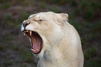 Een portret van een brullende Witte Leeuwin. Witte Leeuwen zijn een speling van de natuur en in het wild zijn de overlevingskansen van deze dieren door het ontbreken van een natuurlijke schutkleur minder groot.