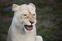 Een portret van een brullende Witte Leeuwin. Witte Leeuwen zijn een speling van de natuur en in het wild zijn de overlevingskansen van deze dieren door het ontbreken van een natuurlijke schutkleur minder groot.