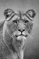 Portret foto van een leeuwin digitaal bewerkt met andere achtergrond in zwart wit