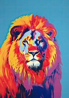 De afbeelding van een leeuw wordt gepresenteerd in een pop-artstijl met visuele elementen en een kleurenpalet van donker hemelsblauw en oranje.