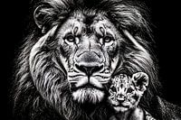 Dit indrukwekkende zwart-wit ontwerp toont een majestueuze leeuw met zijn kleine welp. De gedetailleerde weergave van de leeuw benadrukt zijn kracht en leiderschap, terwijl de welp een zachte en schattige uitstraling heeft. Het contrast tussen de twee dieren creëert een mooi evenwicht tussen de stoere volwassen leeuw en het speelse jong. Dit kunstwerk is perfect voor wie houdt van natuur en dieren, en het zal een krachtige uitstraling geven aan elke ruimte. Het ontwerp spreekt kracht, bescherming en de band tussen ouder en kind uit, en zal zeker een statement maken in je interieur.