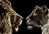 Een prachtig portret van een leeuw en leeuwin in 3d lijnen en strepen die door elkaar lopen. Ik maak mijn werken allemaal zelf en maak geen gebruik van AI programma's (kunstmatige intelligentie). Elk detail wordt door mijzelf aangebracht. Daarom kan ik soms wel uren bezig zijn om een bepaald beeld te creëren.