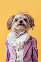 Deze majestueuze leeuwhond combineert elegantie en charme in een prachtig paars pak. Zijn stralende vacht en de fijne franje rond zijn nek geven hem een aristocratische uitstraling. Deze dierlijke persoonlijkheid straalt een air van trots en speelsheid uit, alsof hij net uit een sprookjesachtige balzaal komt wandelen.