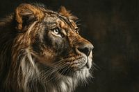 Deze majestueuze afbeelding toont een leeuw in profiel, badend in warm licht dat zijn manen en gelaatsuitdrukking prachtig accentueert. De donkere achtergrond versterkt de dramatiek en laat elke haardos tot leven komen, terwijl zijn vaste blik een gevoel van wijsheid, kracht en kalm leiderschap uitstraalt. De combinatie van realistische textuur en verfijnde belichting maakt dit kunstwerk tot een tijdloos symbool van natuurlijke autoriteit — ideaal voor interieurs die sereniteit en kracht willen uitstralen.
