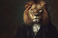 Deze unieke afbeelding toont een indrukwekkende leeuw in een elegante Victoriaanse outfit. Het majestueuze dier straalt kracht en stijl uit, gehuld in een klassiek zwart pak met een luxe witte kraag. Dit beeld combineert natuur en kunst op een bijzondere manier, waardoor het een eyecatcher is in elke ruimte. Perfect voor liefhebbers van dieren en kunst die zoeken naar een uniek stuk voor in huis of op kantoor. Dit portret past uitstekend bij een klassiek of eclectisch interieur en voegt een vleugje elegantie en karakter toe aan elke omgeving.