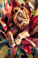 Een majestueuze leeuw troont trots tussen weelderig gebladerte, zijn prachtige gouden vacht glanst in levendige kleuren. De krachtige penseelstreken geven zijn waardigheid en kracht weer, terwijl de omringende planten een harmonieus contrast vormen. Een schilderij vol levendigheid en expressiviteit - de wildernis op zijn mooist.