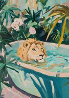 Een leeuw zwemt in het zwembad, omringd door weelderig groen en bloeiende bloemen. Zachte lijnen en vormen, in de stijl van Matisse, pastelkleuren, olieverfschilderij, penseelstreken, gouache-illustratie, natuurlijk licht.