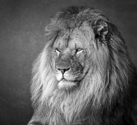Portret van een liggende leeuw digitaal bewerkt met een andere achtergrond en in zwart-wit
