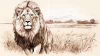 Leeuw lopend in een veld, tekening, leeuw potloodtekening in vintage stijl.