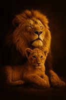 Een volwassen leeuw zit trots en kalm, zijn ogen gesloten in serene rust, terwijl zijn welp tegen hem aan leunt.