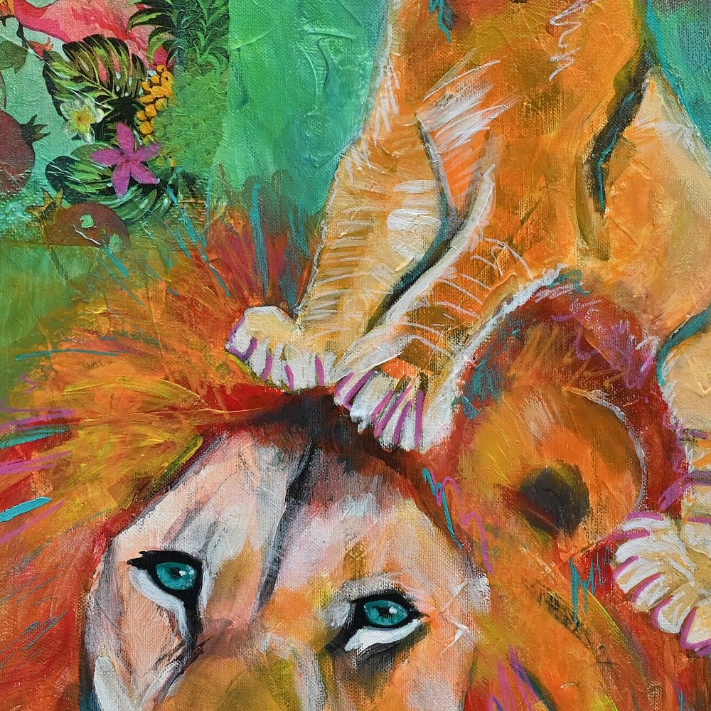 Een prachtig, krachtig en vrolijk schilderij. Deze kleurrijke Majesteit met Welpje op zijn hoofd is een verrijking aan iedere ruimte. Het tovert vanzelf een glimlach op je gezicht. Het is gemaakt met acrylverf op canvas met mixed media technieken.