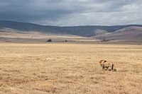 Leeuw op wandel naar andere slapende leeuwen in het gras. In Ngorongoro Crater in Tanzania. Savanne landschap met droog gras.