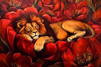 De majestueuze leeuw, wiens gouden manen een koninklijk tintje uitstralen, rust in het midden van een prachtig tapijt van robijnrode bloemen. Zijn vredige gelaat, omlijst door fluwelen bloemblaadjes, belichaamt de perfecte harmonie tussen kracht en tederheid, terwijl de bloemenpracht zijn majestueuze aanwezigheid streelt.