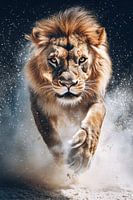 Een krachtige leeuw stormt door een wolk van stof, elke sprong vol energie en vrijheid. Zijn gespierde poten raken nauwelijks de grond terwijl het zand rondom hem opdwarrelt. De beweging van de leeuw is puur en dynamisch, een moment vol snelheid en kracht. Het opstuivende stof vangt het licht, wat zorgt voor een intens en levendig contrast. De gouden manen van de leeuw lijken te dansen in de wind, wat het beeld een extra dimensie geeft. Dit indrukwekkende tafereel vol actie en leven geeft elke ruimte direct een avontuurlijke en krachtige uitstraling, die de aandacht van elke kijker grijpt.