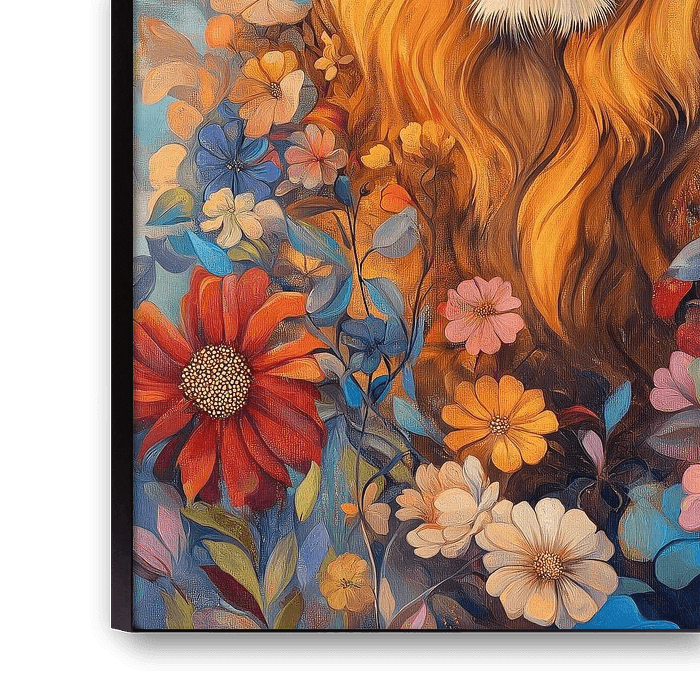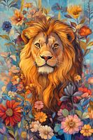 Een leeuw tussen kleurrijke bloemen in de stijl van een schilderij.