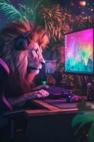 In een fantastische wereld vol kleur en digitale magie zit een majestueuze leeuw, zijn enthousiaste aard versterkt door de headset. Omringd door weelderige vegetatie en een felgekleurd scherm is hij klaar voor epische avonturen in de gamewereld. Zijn gefocuste blik verraadt de fascinatie van een combinatie van natuur en technologie.