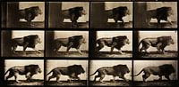Deze foto toont een reeks van 12 opeenvolgende beelden van een leeuw die loopt, waarschijnlijk gemaakt met behulp van chronofotografie. De beelden zijn gerangschikt in een raster van drie rijen van vier, en tonen de leeuw in verschillende stadia van de loopbeweging.
