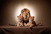 Een majestueuze leeuw staat trots naast zijn welpen tegen een serene, bruine achtergrond. De leeuw, met zijn imposante manen en doordringende ogen, straalt kracht en beschermende genegenheid uit. Zijn welpen, speels en nieuwsgierig, bevinden zich dicht bij hun trotse ouder. De witte achtergrond accentueert de warme gouden tinten van hun vacht, waardoor het beeld een tijdloos en vreedzaam gezinsportret wordt. De compositie straalt liefde, gezinsband en de majesteit van de natuur uit.