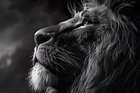 Op de zwart-wit foto staat een Afrikaanse leeuw met een woeste uitstraling tegen een zwarte achtergrond. Zijn manen, wild en vol, lijken te zweven in de schaduwen, terwijl scherpe ogen fel schitteren. De indrukwekkende tanden zijn deels zichtbaar door zijn licht geopende bek, klaar om te brullen. De textuur van zijn vacht, de…