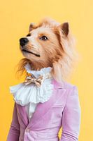 De kleine leeuw zit trots en elegant op zijn troon in zijn glinsterende paarse jas, terwijl de frisse witte kraag een vleugje adel toevoegt aan zijn charmante gezicht. Met zijn zelfverzekerde blik en pluizige, leeuwachtige vacht straalt hij een onmiskenbare mix van waardigheid en speelse elegantie uit die een glimlach op het gezicht van elke toeschouwer tovert.
