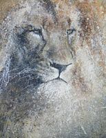 Schilderij van een leeuw, gemaakt door Peter van Loenhout. Figuratief, impressionistisch, modern.