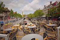 Stadsgezicht vanaf een terras over de grachten in het Friese Leeuwarden.
