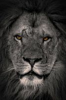 Foto van een leeuw in zwart-wit met alleen de ogen in kleur.