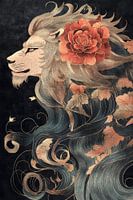 Leeuwenkop met rode bloem en sierlijke manen van Digitale Schilderijen