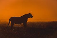Leeuwin onder een hemel in vuur en vlam, vastgelegd in een mistige ochtend die het heel bijzonder en kleurrijk maakte.