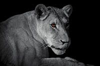 Leeuwin (Panthera leo) op zwarte achtergrond. Dier in zwart-wit met gekleurde ogen.