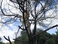 Tijdens het lopen met leeuwen sprong de leeuwin in de boom. Erg mooi gezicht.