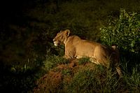 Een leeuwin ligt in de avondschemering te loeren op een lekker maaltje in Tarangire National Park, Tanzania