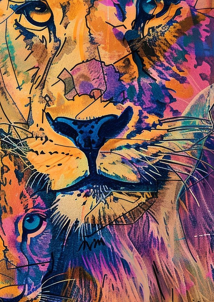 Dit levendige pop-art werk toont de majestueuze aanwezigheid van een leeuwenfamilie, met een leeuw, een leeuwin en hun schattige welp. De compositie is doordrenkt met felle, verzadigde kleuren en dynamische patronen, kenmerkend voor de pop-artstijl. De manen van de leeuw zijn weergegeven met levendige sinaasappels en gelen, terwijl de leeuwin is afgebeeld in opvallende tinten goud en beige. Het welpje, genesteld tussen zijn ouders, voegt een hartverwarmend tintje toe, geschilderd in zachte, speelse tinten.