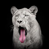 Zwartwit foto van een leeuwin die haar tong uitsteekt