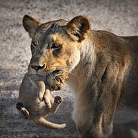 Koop dit leeuwen kunstwerk Leeuwin met pasgeboren leeuwen welp van Chi op canvas, aluminium dibond, (ingelijste) fotoprint, behang en ArtFrame, op maat geprint in Fine-Art kwaliteit.