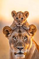 Een betoverend tafereel van genegenheid en bescherming ontvouwt zich onder de gloeiende avondzon. Een majestueuze leeuwin kijkt in de verte met diepe, wijze ogen, terwijl een speels leeuwenwelpje vrolijk op haar hoofd zit, vol nieuwsgierigheid en levensvreugde. Deze harmonieuze band tussen moeder en kind straalt warmte en geborgenheid…