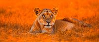 Een majestueuze leeuwin troont in het warme licht van de savanne, haar waakzame ogen stralen kalmte en kracht uit. De goudoranje tint van de omgeving versterkt het gevoel van wildernis en vrijheid. Dit beeld brengt avontuur in elke woonkamer en creëert een sfeer van elegantie en rustgevende sereniteit.