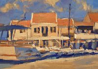 De pierhuisjes zijn iconisch voor dit eiland en gezichtsbepalend voor het dorpje. De boot links is genaamd Lefcothea, genoemd naar de enige echte Paxiotische schoonheid Lefcothea.