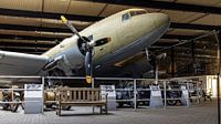 Het vliegtuig, met zijn karakteristieke robuuste ontwerp, staat op een verharde vloer en is omringd door informatieborden die de geschiedenis en het gebruik van de Skytrain tijdens de oorlog belichten. De propellers en vleugels zijn prominent in beeld, en de details van de constructie, zoals de klinknagels en panelen, zijn duidelijk zichtbaar dankzij de uitstekende belichting in de hangar.