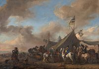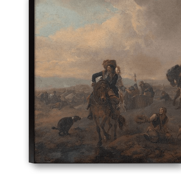 Wouwerman, die zich specialiseerde in de paardenschilderkunst, koos hier een actief tafereel om zijn favoriete onderwerp uit te beelden. Donkere wolken drijven over de grond, de vlaggen wapperen en de paarden zijn onrustig.