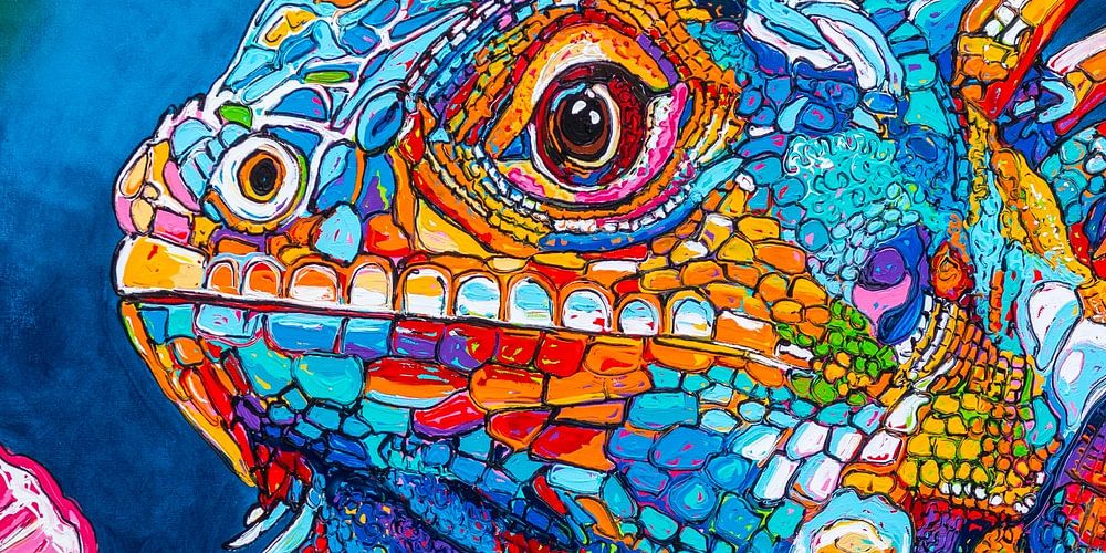 In dit kleurrijke schilderij ontmoeten twee tropische iconen elkaar: de majestueuze leguaan en de bloeiende banaan bloesem. De felle kleuren en gedetailleerde textuur maken het werk tot een visueel feest. De achtergrond in diep blauwgroene tinten zorgt voor een prachtig contrast met het warme palet van de iguana en de bloemen. Dit kunstwerk vangt het mysterieuze en levendige karakter van de Caribische natuur in één krachtig beeld.