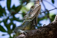 Een leguaan beklimt een boom opzoek naar voedsel.